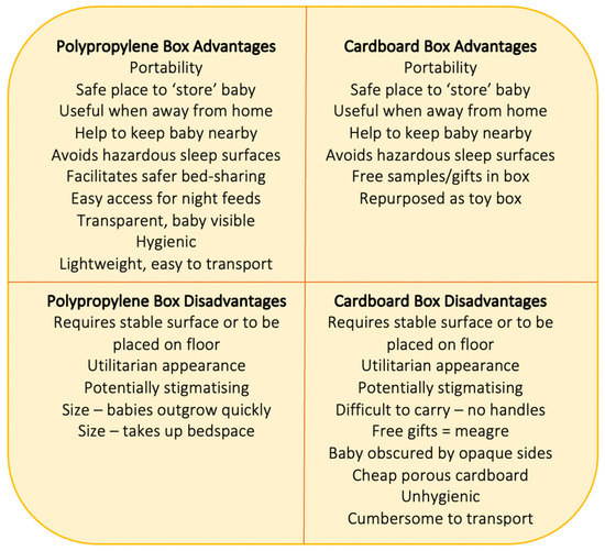 Overall, parents described more benefits and uses for the polypropylene boxes (see Figure 5). These included the ability to use the smaller shallower box on the parental bed at night to keep the baby close while reducing the hazards of bed-sharing with a smoker for instance. When using the box in this manner the transparency of the polypropylene box was also a benefit, allowing parents and babies to easily see one another while the shallow sides meant parents could touch their babies while lying next to them with easy access for night-time feeding. Parents also reported that the polypropylene boxes were hygienic, easy to clean and disinfect, and small enough to transport under a pushchair. Not mentioned by parents in this survey, but highlighted by health professionals [9] and other authors [29], is the potential for cardboard boxes to undermine breastfeeding by facilitating separation of mothers and babies, and making it difficult for mothers to see their babies’ early feeding cues, while the shallow polypropylene boxes had the potential to support breastfeeding by making night-time feeding easier by keeping mother and baby in close proximity both day and night.