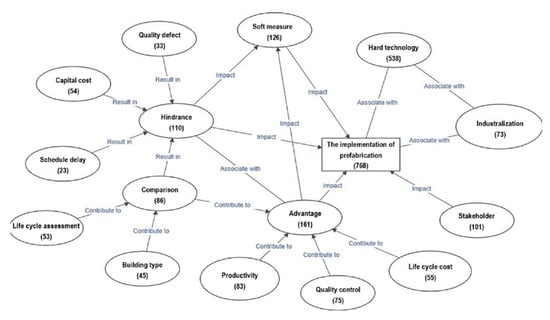 Next, “Model” could be used to develop a tentative framework based on the relationship between the nodes. In the tentative framework (see Figure 1), the rectangle represents the boundary of this research, which is “The implementation of prefabrication”, while the ellipse means the node generated in the coding process. The various arrows between two shapes indicate different relations, such as “Associate with”, “Impact”, “Result in”, and “Contribute to”. In addition, the number in each shape represents the total number of papers related to the specific theme and suggests the specific relationship between the two themes. It is worth noting that a paper might have more than one theme and relationship.