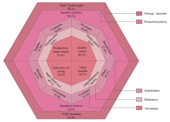 This framework concludes five major components: (a) the “Advantages” presenting the benefits for adopting prefabrication; (b) the “Hindrances” indicating the obstacles of the adoption of prefabrication; (c) the “Stakeholders” revealing stakeholders’ attitudes and behaviors toward prefabrication; (d) the “Promotion policies” stating the policies being formulated by the government for promoting prefabrication; (e) the “Strategy spectrum” referring to the approaches including the “Hard technologies” and “Soft measures”. In those components, components (a), (b), and (c) were identified according to the second-level nodes in Figure 2. Component (d) was obtained from reviewing all nodes proposing policies; component (e) was summarized by the above components. Furthermore, the existing research can be examined from more than one perspective. This systematic framework helps researchers to grasp a general picture of existing studies of prefabrication implementation.