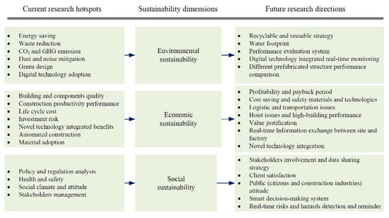 The potential future research directions of the prefabrication studies are the recyclable and reusable strategies, water footprint, performance evaluation system, digital technology integrated real-time monitoring, and different prefabricated structure performance comparison in the environmental sustainability dimension. The areas that require further exploration in the economic sustainability dimension are profitability and payback period, cost-saving and safety materials and technologies, logistic and transportation issues, hoist issues and high-building performance, value justification, real-time information exchange between site and factory, and novel technology integration. In terms of social sustainability, the policy effectiveness quantification, client satisfaction, public attitude and involvement, smart decision-making system, and real-time risks and hazards detection and reminder system are the areas to be investigated.