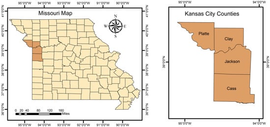 The study area is Kansas City, MO. Kansas City lies within Jackson County, with some portions spilling into Clay, Cass, and Platte counties between latitude 39°05′59″ N and longitude 94°34′42″ W (Figure 1). The space-time analysis was conducted in all four Kansas City counties. Based on the U.S. Census Bureau American Community Survey, Kansas City, MO had an estimated population of 508,090 in 2020. Approximately 51.5% of the population was female, 60.9% was White, and 23.1% of the total population was under 18 years old [].