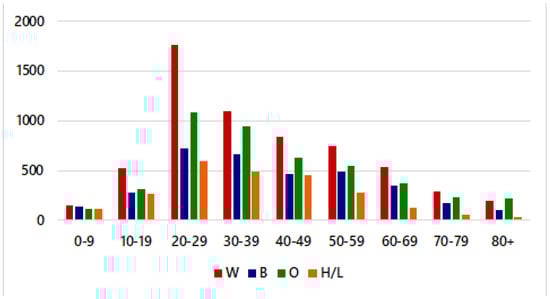 Figure 2 shows that individuals aged 20–29 years had the highest number of confirmed cases in Kansas City, MO. Moreover, White individuals aged 20–29 years had the highest number of confirmed cases. Note that to access potential racial disparities in the spread of COVID-19, it is important to consider the proportion of confirmed cases in Kansas City, MO with respect to race/ethnicity. Figure 2 shows the raw data for individuals who are White (W), African American (B), Other (O), and Hispanic/Latino (H/L).