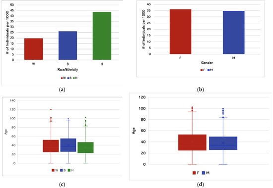 Prevalence was calculated by dividing the number of cases within a specific racial group by the total number of individuals belonging to that same racial group in Kansas City, MO, and multiplying that decimal by 1000 to obtain the prevalence per 1000 individuals. Figure 3a,b represents the prevalence of COVID-19 positive cases per 1000 with respect to race/ethnicity and gender. It was observed that Hispanics had higher prevalence than White and African American groups. Figure 3c,d represent the average age of COVID-19 cases with respect to race/ethnicity and gender, respectively.