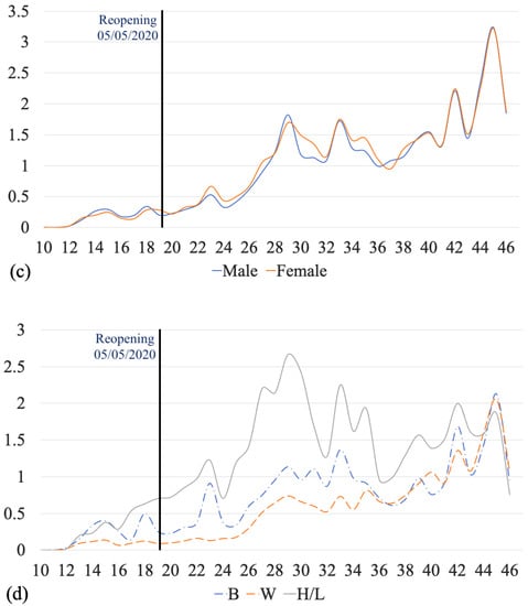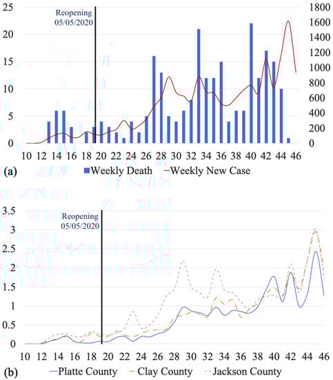 Figure 4a shows weekly COVID new cases and mortalities in Kansas City, MO, during March–November 2020. The total number of cases during March–November 2020 was 17,650, where 648 cases occurred before reopening (5 May 2020), and the rest (17,003) after reopening. The time series of the cases (shown with a red curve) has multiple M-shaped (double-top) curves. There is a small “double-top” from the 12th week to the 20th week with the maximum values in the 15th and 18th weeks, and the minimum in the 16th week. There are also two “double-tops” with larger magnitudes, one from the 27th week to the 37th week and the other from the 41st week to the 46th week. Figure 4b shows the graph of weekly cases per thousand for Clay County, Platte County, and Jackson County. Before the 16th week, all counties had similar trends of cases per thousand, but Jackson County had more cases per thousand than Clay County and Platte County. Between the 22nd week and the 37th week, Jackson County had more cases per thousand. Between the 39th week and the 40th week, Platte County had more cases per thousand. From the 41st week, all counties had the same trend of cases per thousand, but Platte County had fewer cases per thousand than Clay County and Jackson County. Figure 4c shows weekly cases per thousand by gender in Kansas City. Males and females had similar trends and similar rates of cases. Figure 4d shows weekly cases per thousand by race in Kansas City. The three races are White, African American, and Hispanic/Latino. Hispanic/Latino always had the highest rate of cases. Before the 36th week, African-American individuals had higher rates than White individuals. After the 36th week, African American and White individuals had similar trends and rates of cases. From week 44 to week 46, the three races had a close trend and rate of cases.