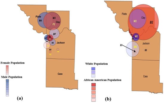 Figure 5a and Table 4 provide the characteristics of the spatial clusters of COVID-19 with respect to gender in Kansas City at the zip code level from March to November 2020. We observed five statistically significant clusters of females and eight statistically significant clusters of males. The relative risks (RRs) of the primary clusters F1 (female) and M1 (male) were almost the same, and both clusters were in downtown Kansas City, located in Jackson County. As we can see in Figure 5a, the clusters of the male population were more scattered than those of the female population. In addition, note that the male and female populations share three clusters.