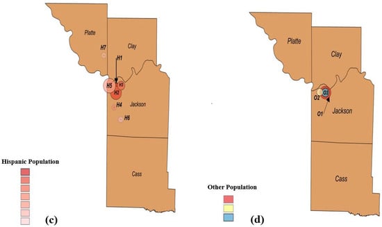 Figure 5c and Table 6 show the spatial clusters of COVID-19 with respect to race and ethnicity for Hispanic population in Kansas City at the zip code level from March to November 2020. There were seven spatial clusters of Hispanic population. These clusters had the highest prevalence compared to those of the African American and White populations, and they were scattered mainly in Jackson County. Cluster H4 of the Hispanic population had an extremely large RR of 4.77. Figure 5d and Table 6 show the clusters that belong to other races, including Asian, American Indian, and Hawaiian and Pacific Islander populations. The spatial clusters for these races were located in Jackson County, specifically downtown Kansas City.