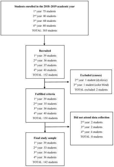 All university students enrolled in the 2018–2019 academic year at the Faculty of Nursing of the University of Cantabria (Spain) aged between 18 and 30 years were included in the study. Those with sensory deficits or diseases that prevented the performance of the neuropsychological tests were excluded. A total of 303 students initially enrolled in this study, of which 142 finally participated (Figure 1).