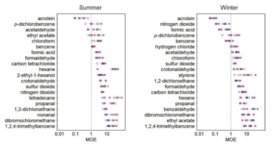 Figure 2 shows the distributions of MOE calculated from the measured concentrations. In both seasons, the chemicals were vertically arranged according to the minimum MOE. The lower the MOE, the higher the health risk. An MOE of <1 indicated that the measured concentration was higher than the RfC. In this study, the chemicals with an MOE of ≤1 for personal exposure had the highest health risk. These chemicals were acrolein, p-dichlorobenzene, and acetaldehyde in summer, and acrolein, nitrogen dioxide, formic acid, p-dichlorobenzene, and benzene in winter.