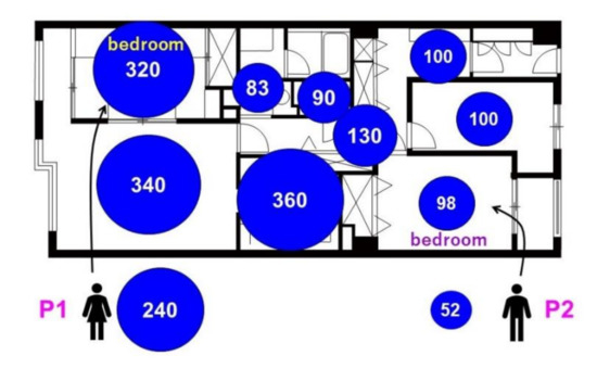 Concentrations of nitrogen dioxide in winter with the floor plan. Each circle area and number shows the concentration (μg/m3) in the space or the resident.