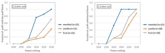 Surprisingly, panelists using the 1.2 Ω coil reported dry puff flavor at lower power settings than those using the 1.6 Ω coil (for all three e-liquids). At the highest setting (25 W) with the 1.2 Ω coil, dry puff flavor was reported for >90% of puffs regardless of flavor, whereas with the 1.6 Ω coil, this was only the case for the menthol-flavored e-liquid. For the fruit- and vanilla-flavored e-liquids, even at the highest power setting, only 71% and 42% of puffs were reported to have dry puff flavor with the 1.6 Ω coil.