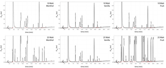 Figure 2 shows typical chromatograms for the three different e-liquids examined at the lowest (10 W) and highest (25 W) power settings. The concentration of the 11 dry puff markers was found to increase strongly at high power settings.