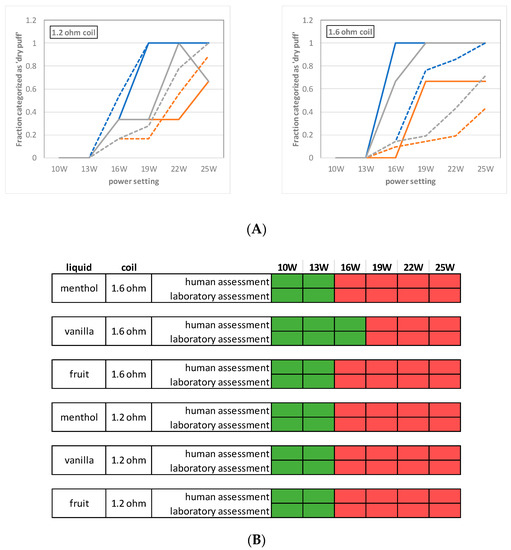 (A): Dry puff flavors of human assessment (dotted lines; these are the same data as shown in Figure 1) compared with the categorization based on laboratory analysis of dry puff markers (solid lines). Colors indicate flavor: menthol:blue, vanilla:orange, fruit:grey. At 25 W using the 1.2-ohm coil and the fruit-flavored e-liquid, one of the three laboratory measurements yielded unexpectedly low amounts of the dry hit markers, resulting in the unexpected “drop-off” of the graph from 22 W to 25 W. This was likely caused by a technical problem with the e-cigarette or vaping machine that occurred during this measurement, but the data were nevertheless retained because the reason is unknown. (B): Suitability of different power settings for each coil/liquid combination, as assessed by human e-cigarette users and based on the amounts of dry puff markers measured in the laboratory. For the “human assessment”, red indicates that 10% or more of the puffs for that liquid/coil/power setting combination were reported by the e-cigarette user panel to have dry puff flavor. For the “laboratory assessment”, red indicates that one or several dry puff markers exceeded its cutoff value (Table 1) for one or more of the three puffs analyzed.