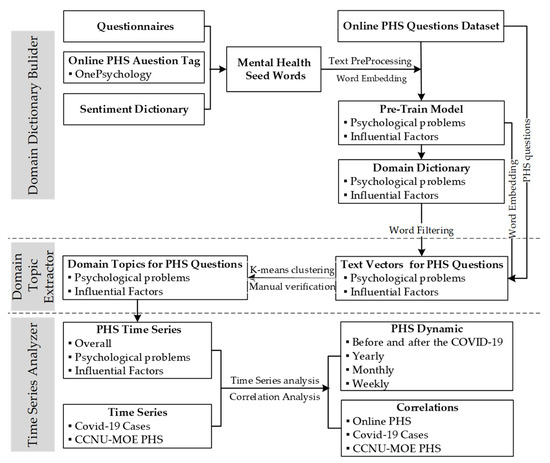 The second approach is text mining technology. The majority of previous studies crawled posts from social media platforms, e.g., Tweets and Weibo, then utilized sentiment analysis or topic modeling to explore the emotions and topics that appeared in the posts [8,9,10,11]. It is an ecological approach; that is, the data can reflect the temporal dynamics of psychological problems in real-time and over a long period, which may compensate for the deficiencies of questionnaire surveys. However, because of the most previous studies crawled texts from social media platforms, the findings of these studies have several limitations. First, some certain groups of the general public like to use social media platforms to express their opinions, while others are less likely to use them or to express opinions through these platforms. Therefore, existing studies based on these data can only investigate the opinions and attitudes of individuals who actively use social media platforms. Second, the contents of the posts on social media platforms cover a wide range of fields in our lives. Existing studies were only investigating opinions and attitudes about users’ daily lives instead of investigating the temporal dynamics of mental illnesses and psychological problems.