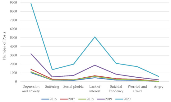 To investigate the association between the COVID-19 pandemic and the PHS populations related to different psychological problems and influential factors, we analyzed the general trends of the number of posts made by PHS in the OMHS community from 2016 to 2020 (see Figure 2). In general, the amount of PHS posts showed a slight upward trend in 2016–2018 and an increase in 2018–2019. During the COVID-19 pandemic, the amount increased rapidly. We calculated the CAGR of the PHS posts from 2016 to 2020. Specifically, the CAGR of the PHS posts in the OMHS community was only 54% from 2016 to 2019, while the CAGR of the PHS posts was 179% from 2019 to 2020. The CAGR in the COVID-19 pandemic was about 3.315 (179%/54%) times that of the previous level.