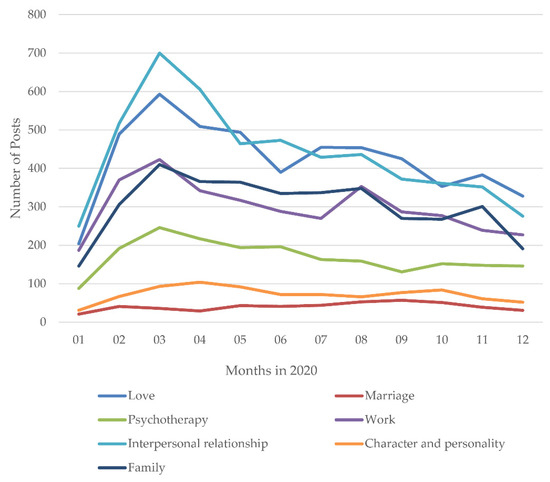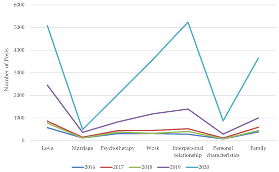 Figure 4 shows the yearly trends of the posts related to influential factors. Specifically, from 2016 to 2019, the CAGRs of love, marriage, psychotherapy, work, interpersonal interaction, personal characteristics, and family were 62.47%, 45.98%, 38.6%, 55.77%, 70.79%, 56.23%, and 37.73%, respectively. From 2019 to 2020, the CAGRs of love, marriage, psychotherapy, work, interpersonal interaction, character, and family were 107.31%, 33.52%, 147.8%, 202.62%, 275.34%, 204.55%, and 264.93%, respectively. The results show that the CAGR remained at a high level, especially for love, work, interpersonal interaction, personal characteristics, and family. With the exception of marriage, the CAGRs of other influential factors ranged from 107.31% to 275.34% during the COVID-19 pandemic. The CAGR during the pandemic was about 2.764 times those of the previous level on average. Notably, the increases in work, interpersonal interaction, and personal characteristics were sharp, about 6.508, 3.370, and 2.724 times those of the previous level.