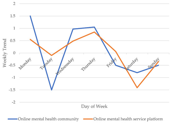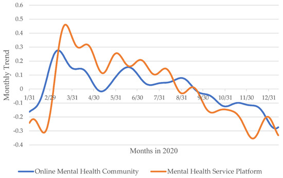 To further explore and validate the correlation between the COVID-19 pandemic and the temporal dynamics of the PHS population, we used the time series analysis method to recognize the temporal patterns of the number of PHS posts in the OMHS community and platform during the COVID-19 pandemic (see Figure 5 and Figure 6). Concerning the weekly trends, as shown in Figure 5, two OMHS platforms showed a higher number of posts from PHS on Mondays. In terms of monthly trends, as shown in Figure 6, the dynamics in the number of posts made by PHS on two OMHS platforms can be divided into four stages in 2020: sharp growth (January–March), Significant decline (April–June), slight rebound (July–September), and slow decline (October–December). In addition, there was a positive correlation for the real number of PHS posts between the two OMHS platforms (r = 0.455, N = 331, p < 0.01). There was a positive relationship between the monthly trends of PHS behavior in the OMHS community and those on the MOE-CCNU Mental Health Service Platform (r = 0.793, N = 331, p < 0.05).
