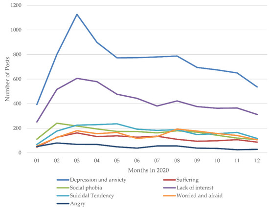 The monthly trends of the number of PHS posts related to psychological problems during the COVID-19 pandemic.