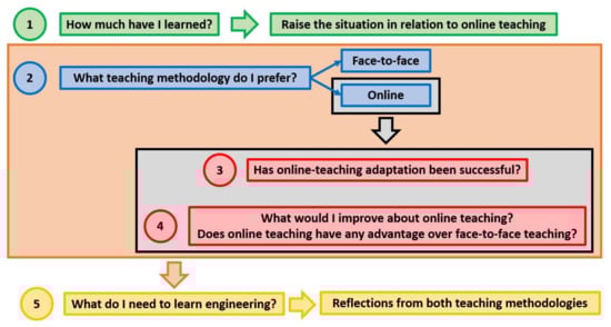 The first question of this survey was intended to ask students to consider how they had learned during that week, raising the situation of online teaching that they were experiencing. Subsequently, questions 2, 3, and 4 were intended to stimulate student reflection on the advantages and disadvantages of each type of teaching regarding their learning, comparing both teaching methodologies. In question 5, the students were asked to indicate what might be needed for quality teaching, so that they could successfully learn based on their experiences during both face-to-face and online teaching. Questions 1 and 2 were mainly used to identify the three phases of behavior explained in Section 2.1.1. The schematic thought process followed to complete the survey is shown in Figure 1.