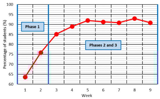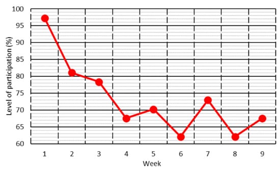 Figure 2 shows the level of student participation throughout the nine weeks of the study. Initially, participation was very high, but subsequently decreased to 60–75% after the Week 4 of online teaching. This behavior corresponded to the usual tendency of an ongoing study that depends on the participation of a certain population group. Initially, the study arouses attention and the level of participation is high. Later on, some people lose interest in the study and drop out, so that only those who considered it useful and relevant continued to participate [].