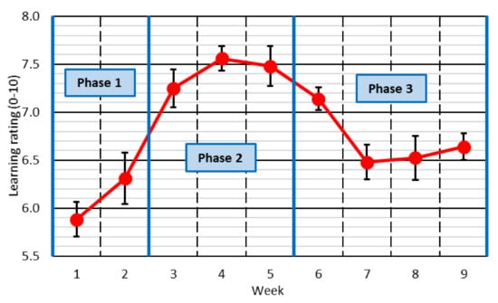 The worst ratings of the learning level were obtained in the first two weeks of the study (rating around 6 out of 10), and then suddenly increased, reaching a learning rating of around 7.4–7.5 from Week 3 to Week 5. Subsequently, the learning rating decreased and was around 6.5 out of 10 during the remaining weeks of the study. This behavior in the assessment showed the three above-mentioned phases of behavior through which a person generally goes when facing a sudden change []:
