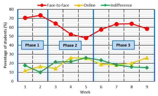 The temporal duration of the three behavioral phases described in the previous section was corroborated through question 2 of the survey. In that question, students had to indicate their preferred teaching methodology: online, face-to-face or indifference. Figure 4 shows the percentage of students who preferred each teaching methodology.