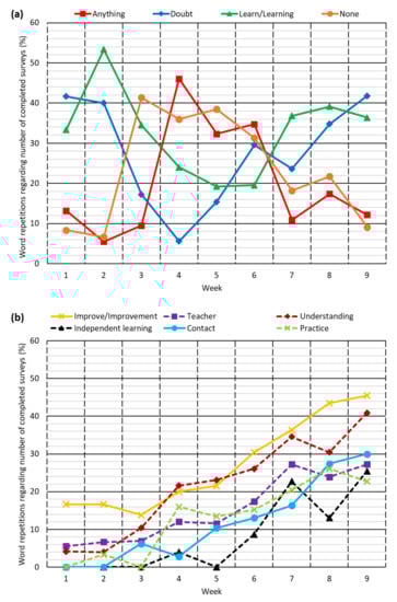 - Finally, for question 4, a mixed analysis based on word counting was also performed using ATLAS.ti. The evolution of the number of times that a certain term was cited gave some insight into its relevance among the students over the various weeks of the study [].