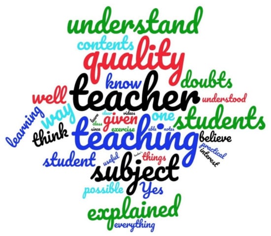 Figure 7 shows a Word Cloud based on word counting obtained from the students’ answers to question 5 of the survey in Week 9. This Word Cloud displays the importance of the term teacher. The teacher is the guide to the course and is in charge of implementing the seven aspects indicated by the students and commented upon in this section. Hence, the role of the teacher is fundamental to promoting student learning. Therefore, the correct work of the teacher in engineering courses is essential [], as discussed in the following section.