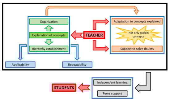 All engineering courses are characterized by a close link between theoretical and practical concepts, which implies that there must be an adequate bridge between both []. This task of simultaneously approaching both theoretical and practical concepts is usually performed by the teacher, so that in traditional engineering courses, the teacher explains the theoretical concepts and then applies them to the resolution of practical cases [], which explains why in engineering teaching the role of the teacher is fundamental. Therefore, theory and practice cannot be approached separately in engineering courses [], but rather, the teacher must find a way to link them and explain both types of concepts simultaneously.