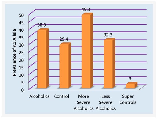 At this moment, RDS controls have not been developed, and that is why simply counting risk alleles as a strategy is accepted-as verified by other investigators with non-addicting gene panels [90]. Follow-up genetic research in this area, resulting in confirmation of positive correlations with dopaminergic polymorphisms, utilizing highly-screened controls (eliminating any compulsive, impulsive, and addictive behaviors in both proband and family), may have significant consequences. In this regard, studies from Blum’s group revealed the importance of non-RDS controls [90]. In a family practice and neurology clinic in Princeton, it was determined that after using a computerized program to eliminate every potential RDS behavior in family members and the proband of 183 patients, only 30 patients were clear of any RDS behavior. The DRD2 A1 allele (known to cause a 30–40% reduction in the number of DRD2 receptors) was observed in about 33% of the unscreened population [91]. However, in the highly screened non-RDS controls, the A1 allele was found in only one patient, which translates to 3.3% [90,92] (see Figure 2). To harness appropriate genetic association studies, investigators need to ensure that hidden RDS behaviors have been systematically eliminated from their control groups; otherwise, spurious results could ensue. This concept has resulted in a disputed study published in JAMA by Yale scientists concerning the role of DRD2 allele and alcoholism whereby controls came from a French cohort of Tourette’s syndrome [93]. The consensus of the literature unequivocally establishes the importance of the DRD2 A1 allele and other associated alleles and gene loci [ANKK1] [94] with 601 articles listed in PUBMED related to alcoholism alone (1/10/21) with preponderance in favor of the risk association.