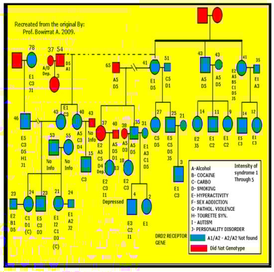 Genotypic results of the Dopamine D2 receptor gene (DRD2) polymorphism of family A (N = 32) corresponded with multiple Reward Deficiency Syndrome (RDS) behaviors [96].