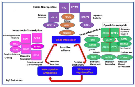 Pharmacogenomic testing of candidate genes such as dopaminergic, endorphinergic, cannabinoid, glutaminergic, GABAergic, receptors, serotonergic and dopamine transporters, and catabolic enzymes of Mono-Amine–Oxidase (MAO-A) and Catecholamine–Methyl-Transferase (COMT), and many others seem prudent but is controversial [111]. However, Koob’s group [112] at NIAAA has provided evidence for multiple reward gene association studies, which show significant associations with alcohol use disorder (Figure 4).