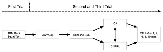 The participants took part in a familiarization session and two experimental sessions within 3 weeks. The familiarization session included the determination of the 1 RM load of the back squat and the performance of two sets until 10% velocity loss at 80%1RM. The experimental sessions were performed in randomized order, one week apart, and each participant performed a single set of back squats at 80% 1 RM until mean movement velocity dropped by 10% as the CA (CA) or a control condition, in which the participants did not perform any CA (CNTRL) (Figure 1). To assess changes in jump height (JH) and mean power output (MP), single sets of two repetitions of the countermovement jump (CMJ) were performed before and after the CA in five time points with 2 min rest intervals.