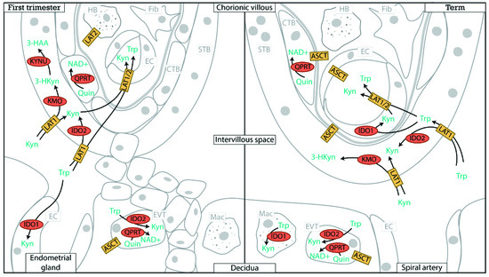 - Sedlmayr, P.; Blaschitz, A.; Stocker, R. The role of placental tryptophan catabolism. Front. Immunol. 2014, 5, 230. [Google Scholar] [CrossRef]