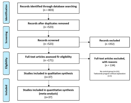 Of the 803 studies, we selected 171 studies, excluding duplicate studies (280) and those unrelated to this study (352). Then, as a result of full-text screening according to the PICO criteria, 131 studies without a control group and three studies that did not explain the Taekwondo training program were excluded. Therefore, we finally selected 37 studies for meta-analysis. All 37 papers were satisfied for both qualitative and quantitative analysis. The detailed process is shown in Figure 1.