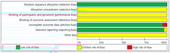 For the qualitative evaluation of the selected literature, the Cochrane Collaboration’s RoB (Risk of Bias) tool [16] was used. The evaluation consists of 7 items, including: (1) generating order of random assignment; (2) hiding assignment order; (3) blinding study participants and researchers; (4) blinding outcome evaluation; (5) insufficient result data; (6) selective reporting; and (7) other biases. The evaluation was rated as low risk, high risk, and uncertain.