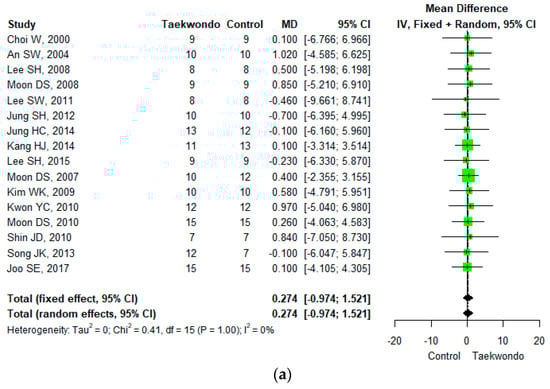 Sixteen studies reported height (total n = 184; taekwondo training group n = 168, control group n = 166). The mean difference (MD) in heights between the Taekwondo training and the control group was 0.274 (95% CI; −0.974, 1.521), and no statistically significant difference was found. For the heterogeneity test, the results of Cochrane Q were p = 1.00, and Higgins’ I2 was 0% (Figure 3a).
