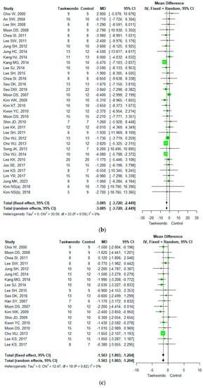 Eighteen studies reported body mass index (total n = 395; 198 Taekwondo training group, 197 control group). The mean difference (MD) of body mass index between the Taekwondo training and the control group was −1.503 (95% CI; −1.803, −1.204). The Body mass index of the Taekwondo training group decreased by 1.5 compared to the control group, and there was a statistically significant difference (p < 0.001). For the heterogeneity test, the results of Cochrane Q were p = 0.82, and Higgins’ I2 was 0% (Figure 3c).