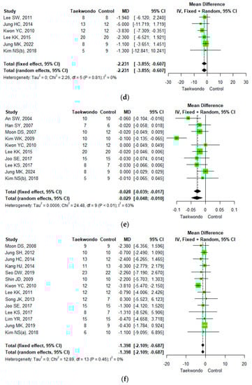 Ten studies reported the waist–hip ratio (total n = 215; Taekwondo training group n= 105, control group n = 110). The mean difference (MD) in the waist–hip ratio between the Taekwondo training and the control groups was −0.029 (95% CI; −0.015, −0.010). The waist–hip ratio of the Taekwondo training group decreased by 0.03 compared to the control group, and there was a statistically significant difference (p < 0.05). For the heterogeneity test, the results of Cochrane Q were p <0.01, and Higgins’ I2 was 0% (Figure 3e).