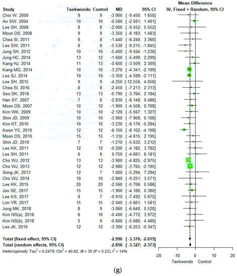 Thirty-six studies reported body fat percentage (total n = 750; taekwondo training group n= 371, control group n = 379). The mean difference (MD) in body fat percentage between the Taekwondo training and the control group was −2.850 (95% CI; −3.327, −2.373). The body fat percentage of the Taekwondo training group decreased by −2.90% compared to the control group, and there was a statistically significant difference (p < 0.001). For the heterogeneity test, the results of Cochrane Q were p = 0.23, and Higgins’ I2 was 14% (Figure 3g).