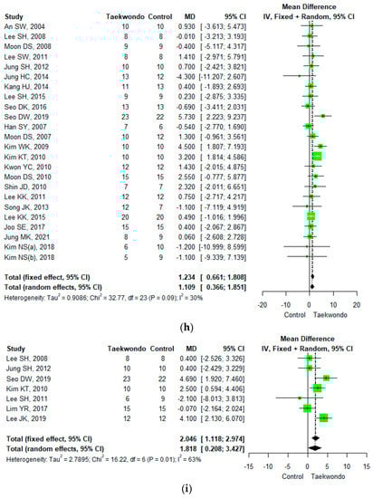 Seven studies reported muscle mass (total n = 170; Taekwondo training group n = 84, control group n = 86). The mean difference (MD) in muscle mass between the Taekwondo training and the control group was 1.818 (95% CI; 0.208, 3.427). The muscle mass of the Taekwondo training group increased by 1.82 kg compared to the control group, and there was a statistically significant difference (p < 0.05). For the heterogeneity test, the results of Cochrane Q were p = 0.01, and Higgins’ I2 was 63% (Figure 3i).