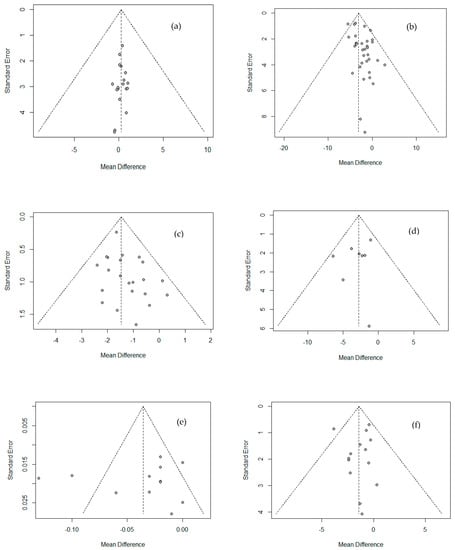 Funnel plots were used to analyze publication bias or effects of small-sized research, as shown in Figure 4. No publication bias was found from Egger’s linear regression test among all variables except weight and body fat percentage, excluding small-sized studies (WC, muscle mass). Also, as a result of Begg’s test using a rank correlation test, no factor showed a significant difference, so the publication bias of the literature used in this study could not be confirmed.