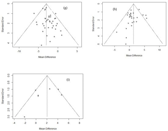 Funnel plot showing the publication bias of Physique and body composition. (a) Height; (b) weight; (c) BMI; (d) WC; (e) WHR; (f) fat mass.; (g) % body fat; (h) lean mass; (i) muscle mass.