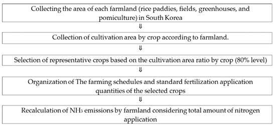 The US and most EU member countries use models to calculate national emissions. This allows for the exact location and the management of specific emissions information (cultivation plans, fertilizer application period, crop nutrient demand, etc.) to be taken into account. Currently, obtaining specific information related to NH3 emissions and model applications are difficult in South Korea. Nevertheless, accuracy in emission control can be improved using the acquired data on farmland area, cultivated crops, and nationally recommended cultivation methods by crop type.