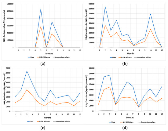 The monthly emissions varied while using Method II for the calculation, as shown in Figure 5. The monthly emission varied according to the fertilizer type when the representative crops were equal, while the overall pattern remained similar. Urea application generated the highest amount of NH3 emissions, followed by compound fertilizers and ammonium sulfate. Ammonium sulfate generated the lowest amount of NH3 emissions in all farmlands. Rice paddies fertilized by urea generated the largest emissions in May (531,000 kg), followed by fields (urea, 153,000 kg in February and October, lowest from December to January), greenhouses (highest emissions in March, even throughout the year), and pomiculture (highest emissions in February and March).