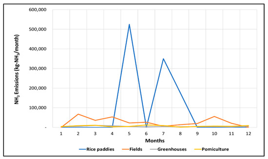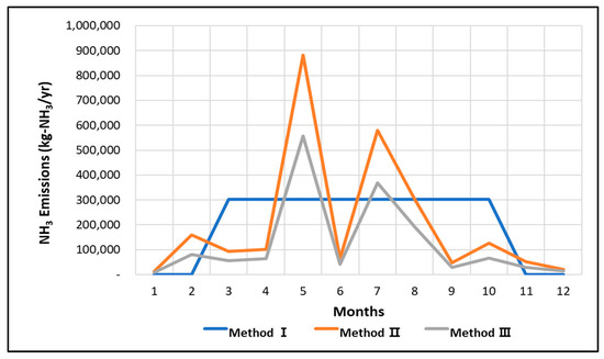 Monthly emissions based on fertilizer application are shown in Figure 8. The regional crop characteristics reflected in Methods II and III are expected to improve the evenly distributed emissions in Method I. In Methods II and III, the largest emissions were generated in May, July, and August. This was likely caused by rice paddy NH3 emissions that exceeded other farmland type NH3 emissions. In fact, rice paddies account for the largest proportion of the area by farmland in Jeolla-do, with 68.1% of rice paddies, 22.9% of fields, 3.1% of facilities, and 5.9% of fruit trees. Rice is cultivated on an area of more than 98% in rice paddies, and according to the standard cultivation method, rice is fertilized in May, July, and August, so it is judged that the graph shown in the figure below is shown.
