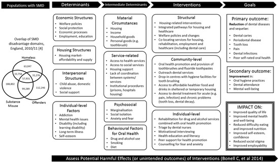 Improving the oral health and related health behaviours of populations facing SMD is an important yet under-researched health-inequalities issue. A systematic review of evidence is needed to identify and investigate interventions that are effective in improving the oral health and related health behaviours of SMD populations. There is also a need to understand factors influencing the implementation of these interventions to ensure that interventions are sustainable and acceptable to SMD populations, service providers and decision makers. This review will address these evidence gaps and provide recommendations for developing interventions that have important and far-reaching implications for the health of SMD populations, with strong translational value.