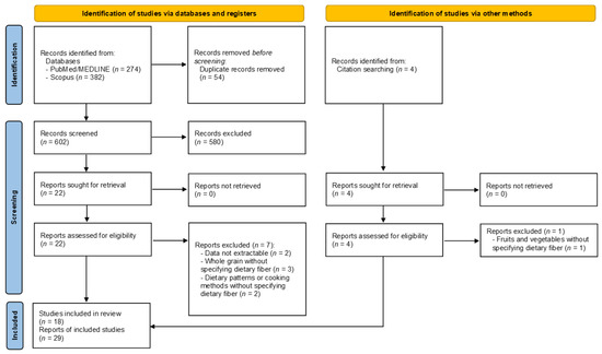 Exclusion criteria were (i) articles not published in English; (ii) people under the age of 18; (iii) full text not available; (iv) interventions and exposures: fiber supplementation; (v) comparators/control: fiber supplementation; (vi) type of study: review article, meta-analysis, trial, expert opinion, commentary, or article with no quantitative information or details. A detailed description of inclusion/exclusion criteria is reported in Supplementary Table S2.