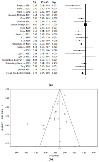 (a) Forest plot and (b) Funnel plot of the meta-analysis comparing dietary fiber intake (lower v. higher intake) and risk of pancreatic cancer (fixed effect model).