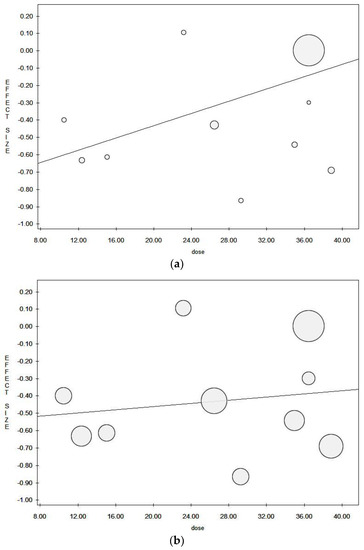 Meta-regression plot for (a) the fixed effect model and (b) the random effect model.