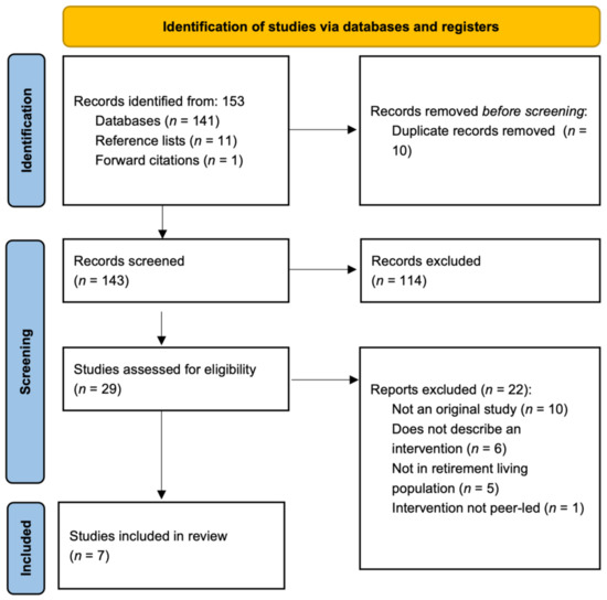 To be included in this review, papers had to be publications of original research (i.e., not a review or protocol paper), written in English, and describe the outcomes of an intervention. The intervention or components of the intervention had to be peer-led and the retirement community setting was necessary. This included assisted living facilities which provide a lower level of care than nursing homes. A peer was defined as a person of a similar age and sociodemographic profile as the intervention participants who had a major role in teaching or facilitating the intervention. Peers must have undergone some form of training. The search was open to any wellbeing intervention in the retirement community setting. Studies were not restricted by participant number or length of study. There was no exclusion due to age or comorbidities of participants as the individual papers had their own restrictions depending on the intervention. Due to the expected low number of eligible published papers, papers were eligible if they were based on randomized controlled trials (RCTs) or cluster-RCTs, controlled and uncontrolled before–after designs.